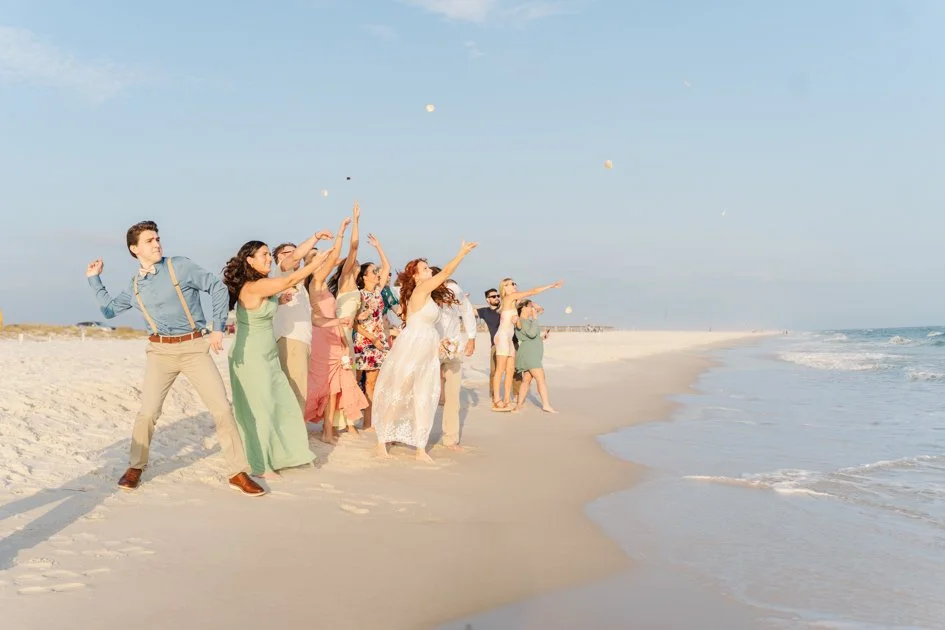 Their ceremony was especially unique. Instead of a traditional sand ceremony, Nicole and Bryan chose a seashell ceremony, a beautiful alternative for a Florida beach wedding. Guests were invited to toss a shell into the ocean while making a wish for the couple—creating a powerful and symbolic moment surrounded by the soothing sound of the waves. This thoughtful ritual made their beach wedding ceremony in Perdido Key unforgettable.