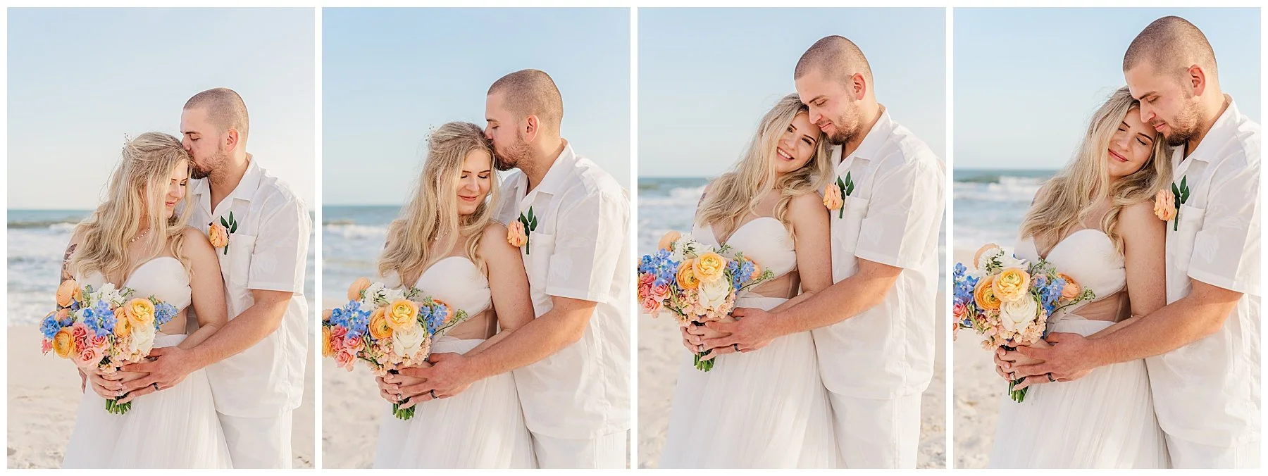 Nick and Grace chose Fort Morgan for their romantic sunset beach ceremony. Their wedding colors—peach, coral, and dusty blue—blended beautifully with the soft spring sky and Gulf waters.