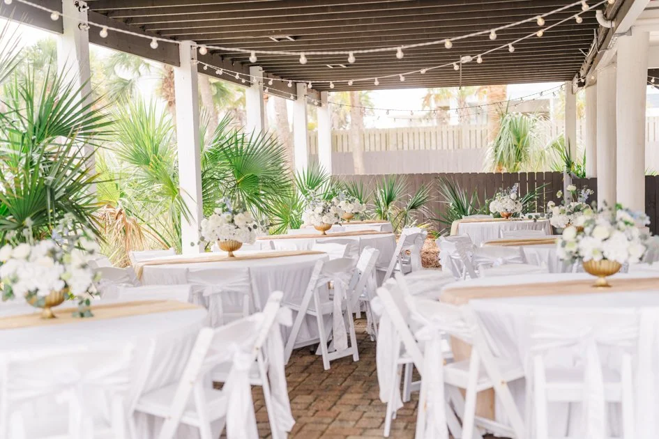 The residence at 1010 Maldonado Dr in Pensacola Beach (contact Paradise Beach Homes to book this house) — a secluded property surrounded by palms, featuring a beautiful pool and a covered lower level ideal for hosting a reception and gathering space.