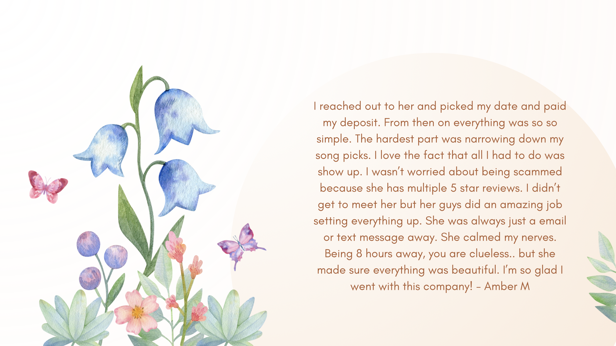 Olga did a fantastic job answering any questions I had regarding colors, flowers, location and anything else that came up. The wedding was beautiful, she came to my location which is hard to find, and was totally seamless. She had everyone set up and ready to go. Photographer did a great job and the pastor was amazing! Thank you so much for all the help!