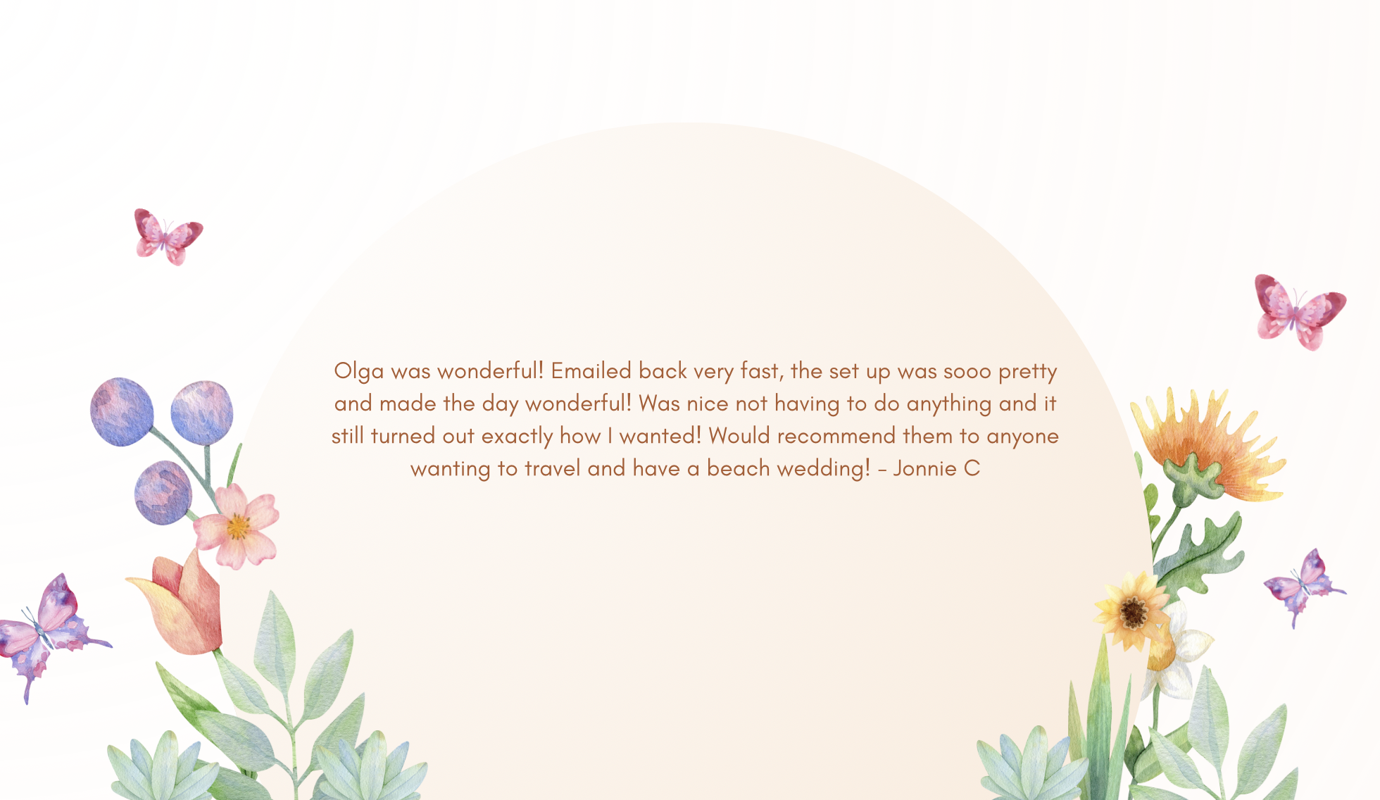 Olga did an AMAZING job! She went far above and beyond my expectations. Also at the last minute, we had to move our wedding date up a day and she very willingly changed it! I was so stressed out and she made it SO much better. I HIGHLY recommend anyone that is wanting a beach wedding to go through her. U will not be disappointed.