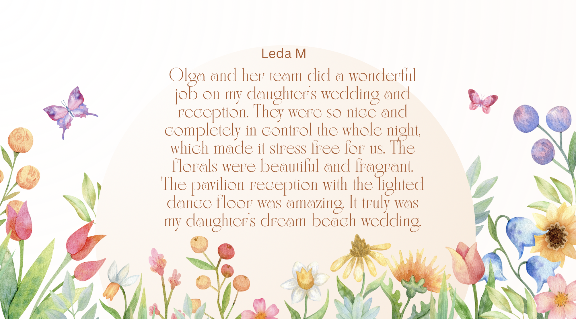 Olga was the best planner we could've had. Our wedding was perfect and looked outstanding and like something out of a story book. By all means I suggest anybody to chose Olga and your dream beach wedding for a taste of magic to happen right in front of you. Thanks Olga we appreciate everything you did!